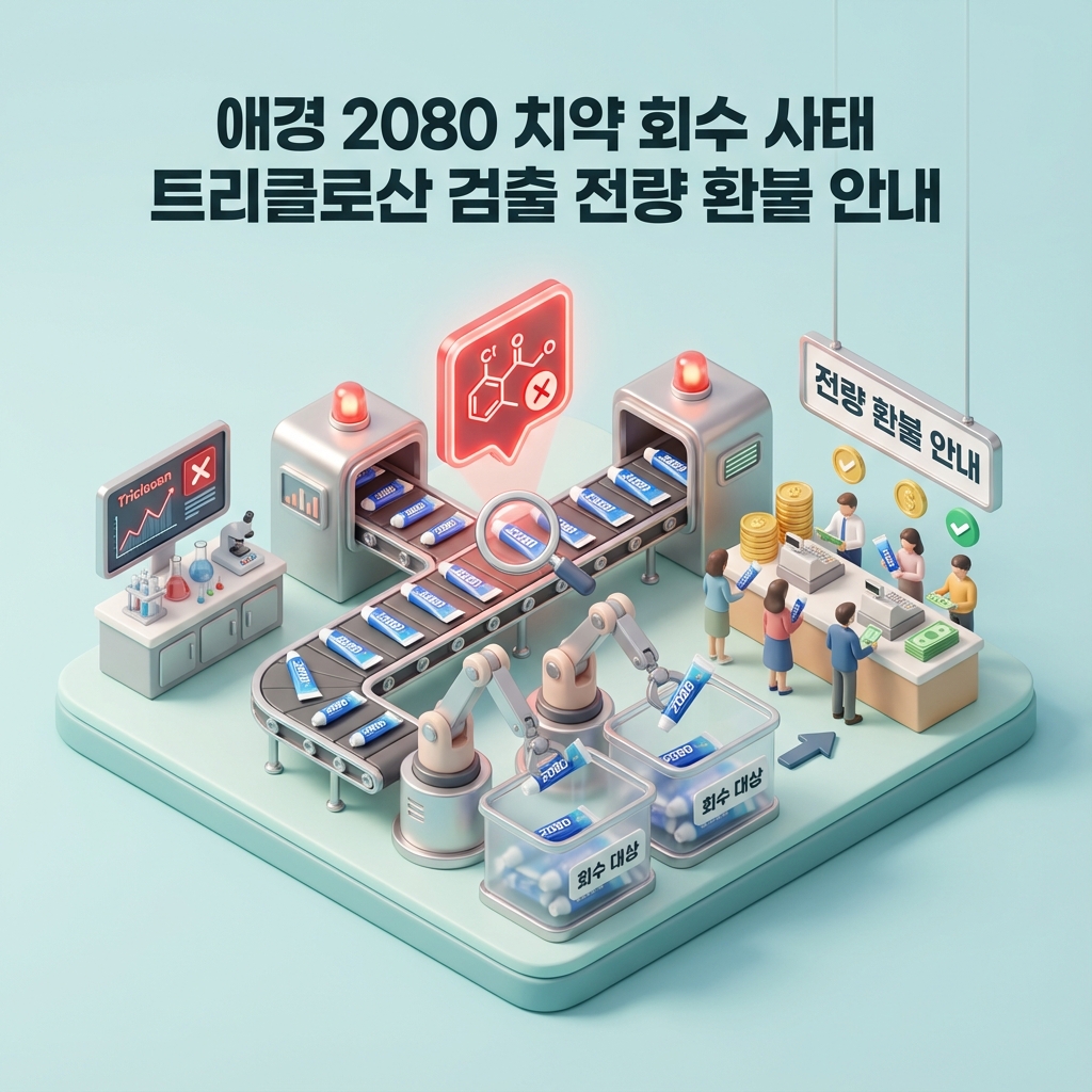 애경산업이 수입 및 판매한 2080 치약 일부 제품에서 구강용품에 사용이 금지된 보존제 성분인 트리클로산이 미량 검출되었기 때문입니다. 트리클로산은 과거 항균 효과 때문에 치약에 사용되기도 했지만, 최근 연구 결과에서 간 섬유화 및 암을 유발할 수 있다는 가능성이 제기되면서 사용이 제한되었습니다. 애경산업은 소비자 안전을 최우선으로 고려하여 해당 제품의 자발적 회수를 결정했습니다.