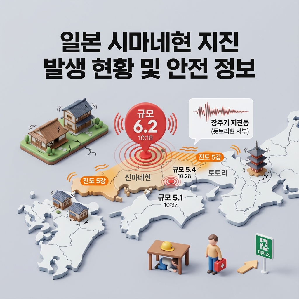 2026년 1월 6일 오전, 일본 혼슈 서부 시마네현에서 규모 6.2로 추정되는 지진이 발생했습니다. 이 지진으로 돗토리현 서부와 시마네현 동부 일부 지역에 진도 5강의 흔들림이 관측되었으며, 추가적인 지진이 이어지고 있습니다.
