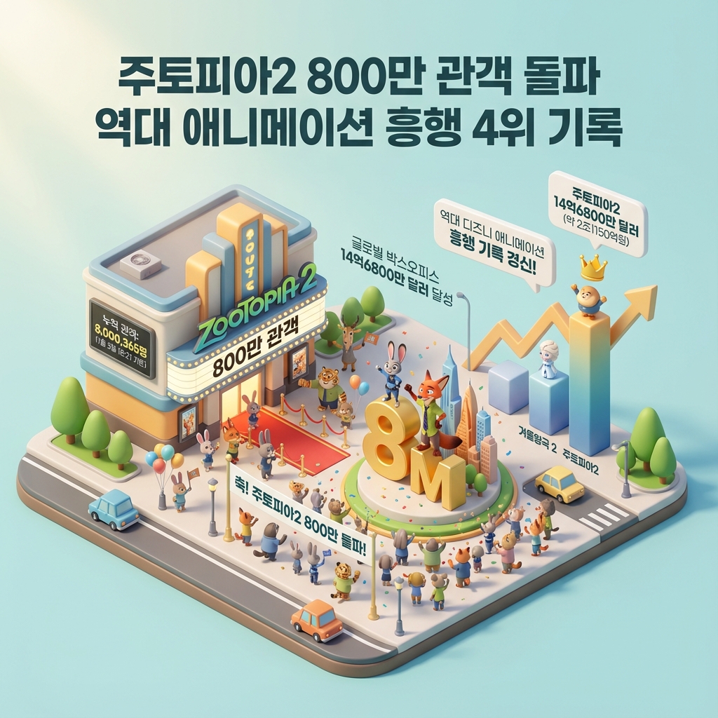 디즈니 애니메이션 ‘주토피아2’가 국내에서 누적 관객 수 800만 명을 넘어섰습니다. 영화관입장권 통합전산망에 따르면 1월 3일 오후 6시 21분 기준으로 누적 관객 수 800만 365명을 돌파하며, 개봉 39일 차에 이룬 쾌거입니다.