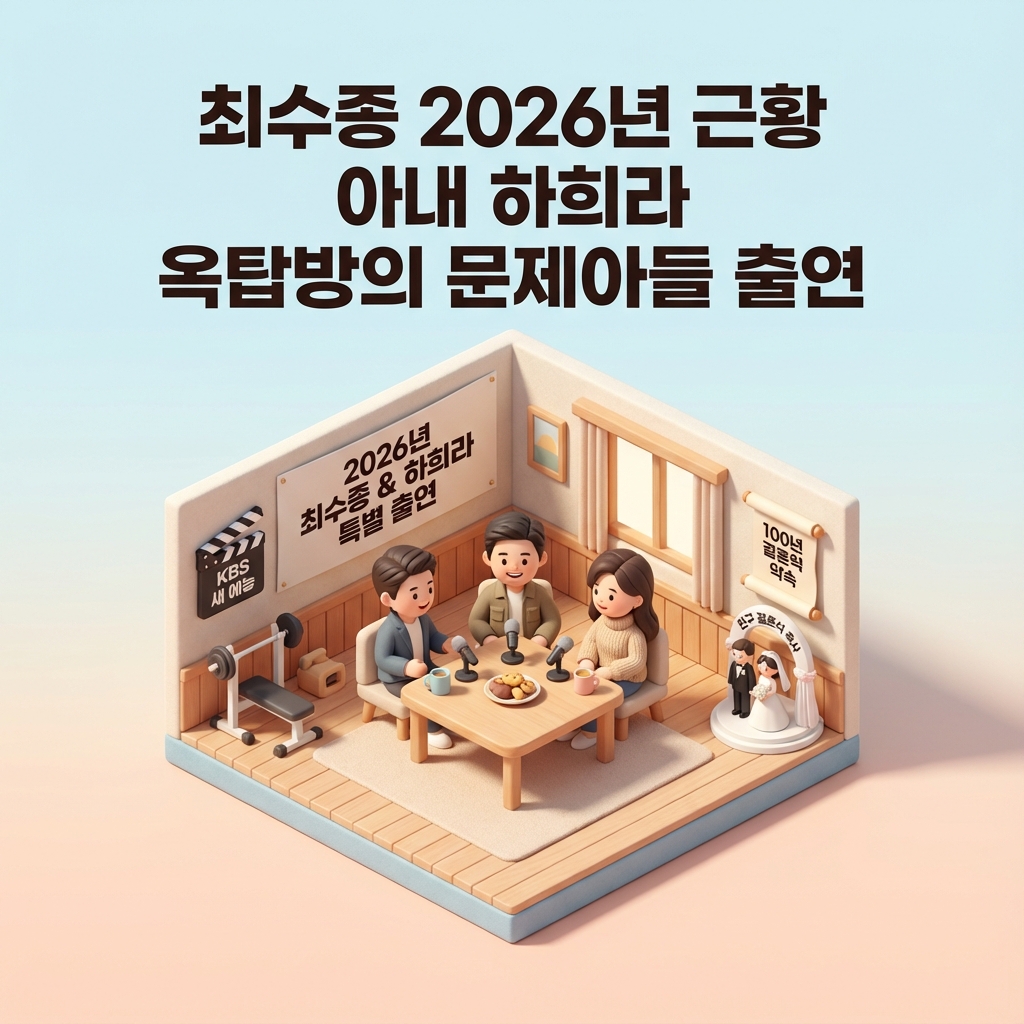 A. 최수종은 아내 하희라와 함께 KBS2 ‘옥탑방의 문제아들’에 출연하여 32년째 잉꼬부부의 일상을 공개했습니다. 해당 방송은 2026년 1월 8일에 방송될 예정입니다.