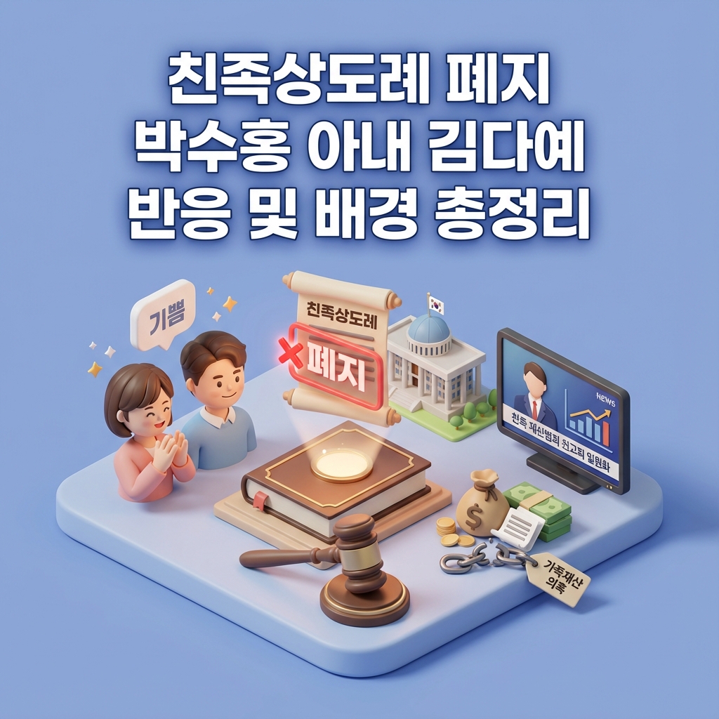 방송인 박수홍 씨의 가족 재산범죄 의혹에서 촉발된 친족상도례 폐지가 확정되면서, 그의 아내 김다예 씨가 SNS를 통해 기쁨을 표현했습니다. 법무부는 친족 간 재산범죄에 대한 처벌 규정을 ‘친고죄’로 일원화하는 형법 개정안이 국회 본회의를 통과했다고 밝혔습니다. 이번 개정은 가족 간 재산범죄에 대한 사회적 인식 변화와 헌법재판소의 헌법불합치 결정에 따른 것입니다.